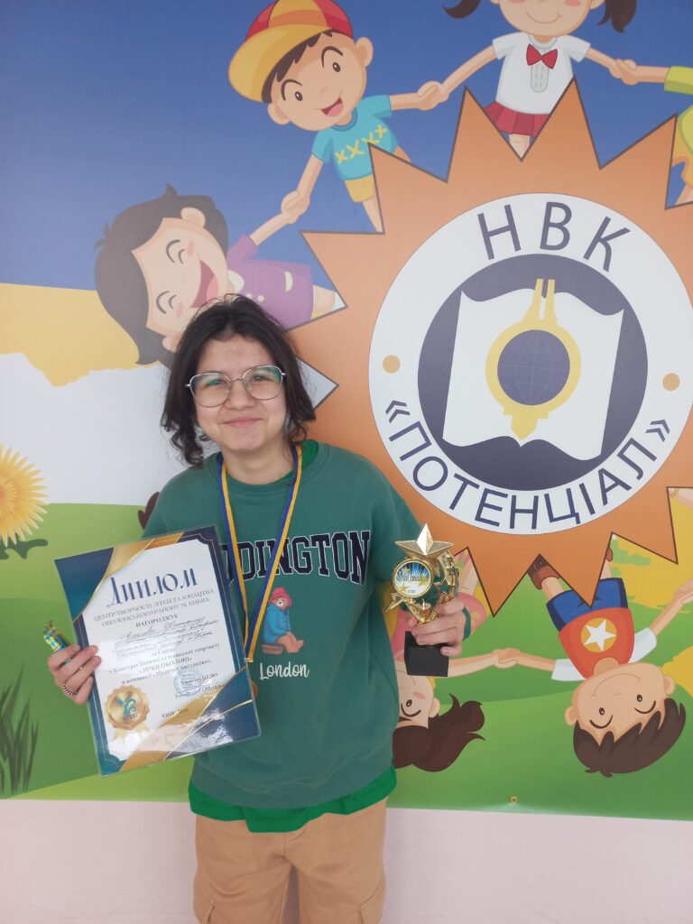 ансамблі, сольні виступи (6-10 років, 11-14 років, 15-18 років). Наші три неймовірні учасниці підготували сольні виступи та змагались у 2-ій віковій категорії. Кожна з них прагнула показати не лише свої вокальні здібності, а й передати широкий спектр емоцій, які викликає музичнна композиція. Виступи вражали !!!!Ми неймовірно пишаємось нашими учасницями, які змогли дійсно запалити та доторкнутись своєю піснею до кожного серця. Дякуємо Артамоновій Мар’яні за чудове виконання пісні «Біля тополі», яка стала ліричною одою , змусивши усіх пригадати і цінність життя, і викликала почуття вдячності тим, хто захищав та нині боронить нашу країну.