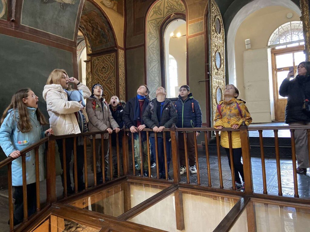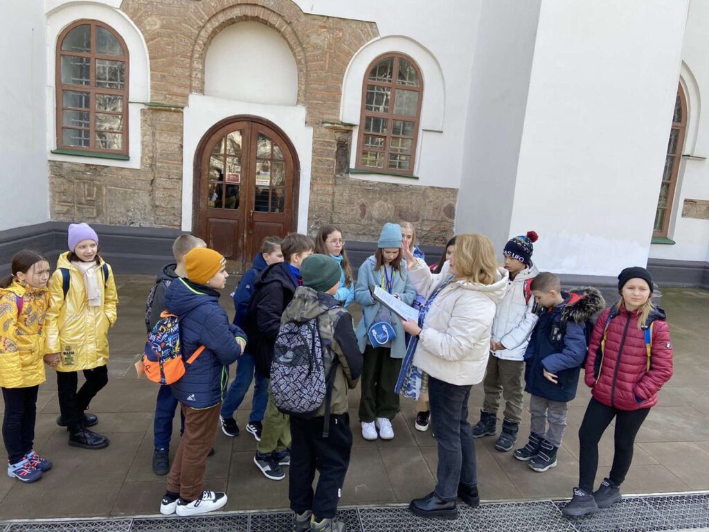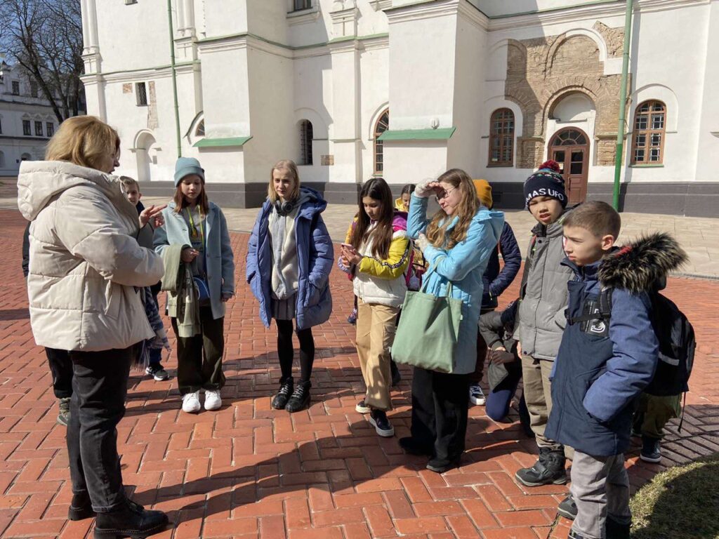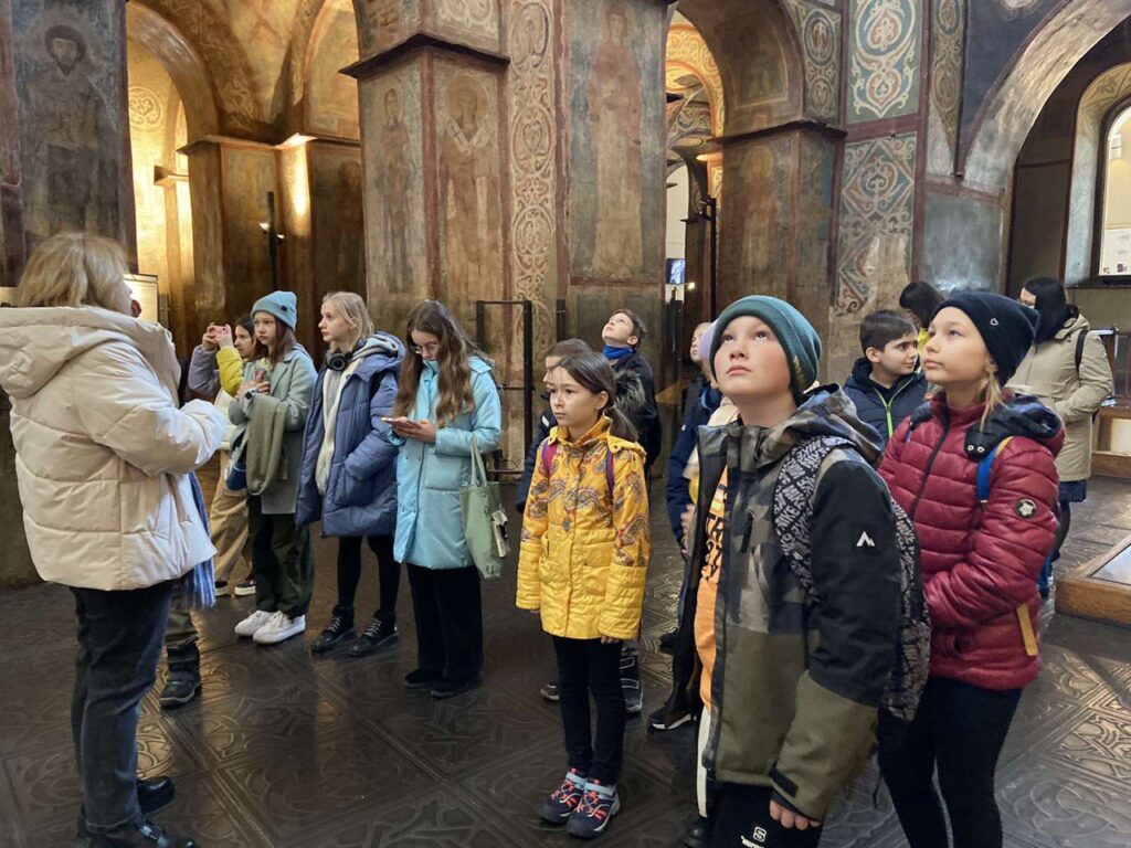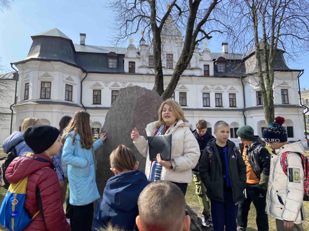 Учням також показали знаменитий саркофаг Ярослава Мудрого, споруджений ще за життя князя. Це стало місцем поховання Ярослава Мудрого і його дружини Ірини. На територію ми увійшли через дзвіницю, яка виконана у стилі українського барокко. Цікавою була розповідь про знамениту бібліотеку Ярослава Мудрого, яку, на жаль, не можуть знайти до цього дня. Вразили учнів і розповіді про школу для дітей в яку приймали усіх бажаючих хлоп’ят, про Трапезну або як її ще називали Теплим будинком. У той час це була найтепліша споруда на території Софії Київської і люди приходили туди погрітися і поспілкуватися.