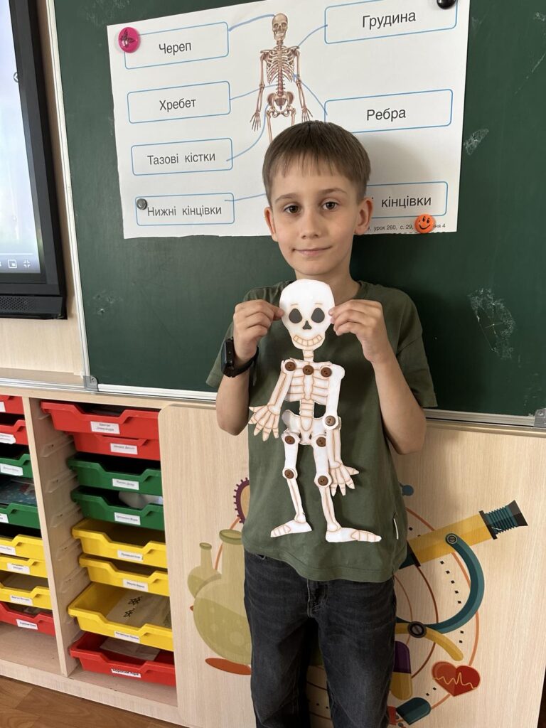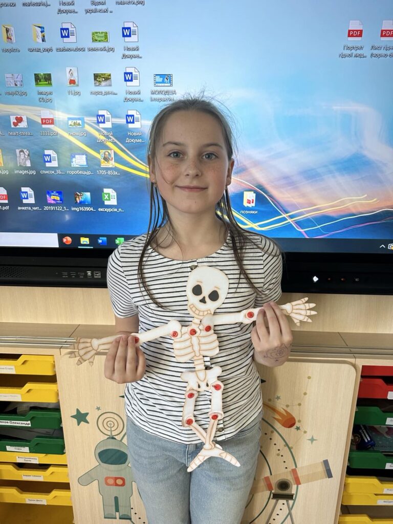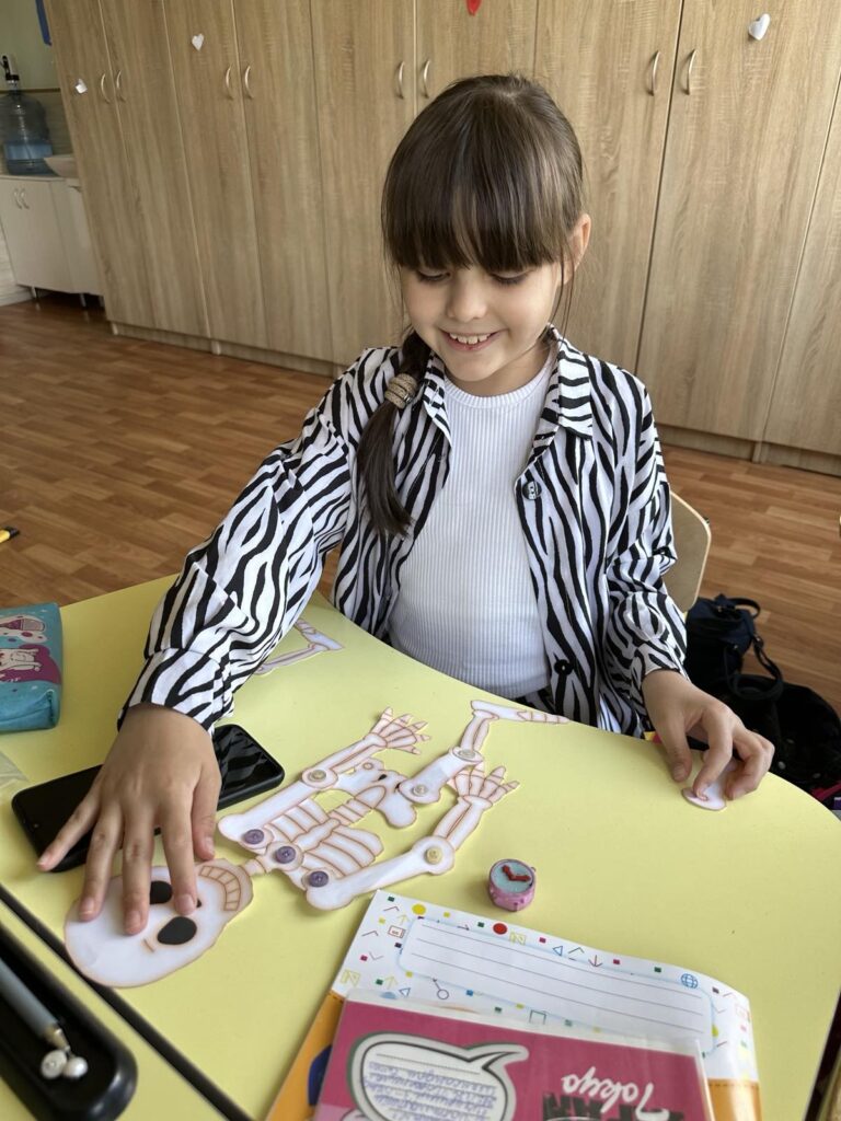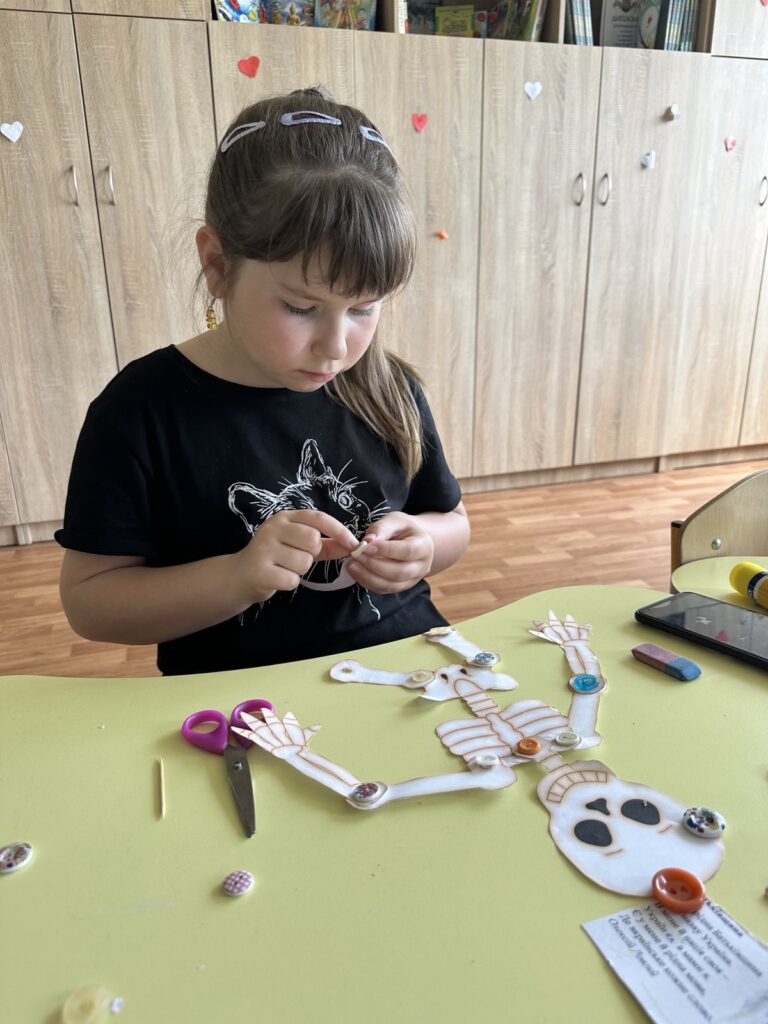 Сьогодні діти створили власну модель скелета за допомогою шаблона кісток, ґудзиків і дротиків. Робота надто кропітка і складна, але всі справились із завданням!