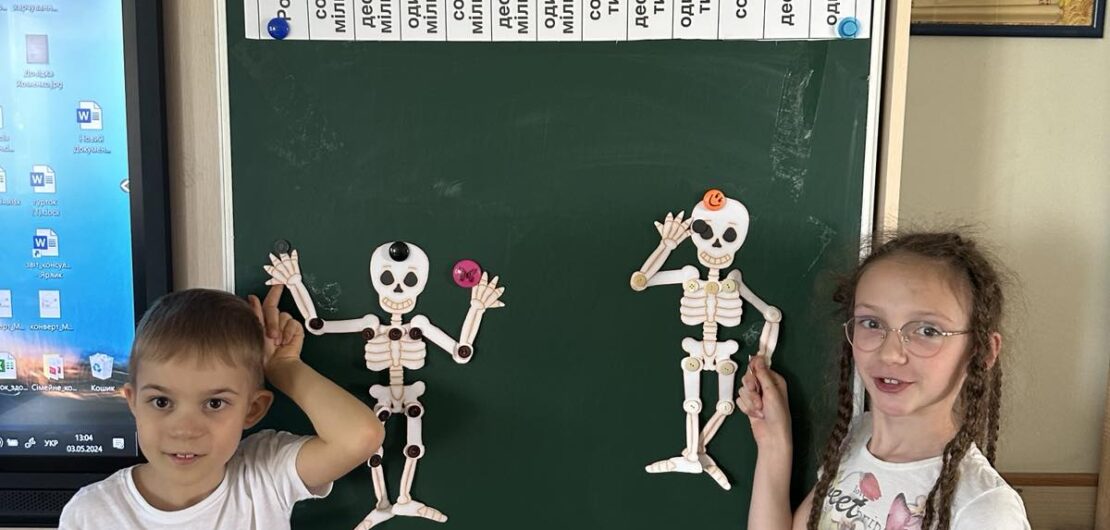 Сьогодні діти створили власну модель скелета за допомогою шаблона кісток, ґудзиків і дротиків. Робота надто кропітка і складна, але всі справились із завданням!