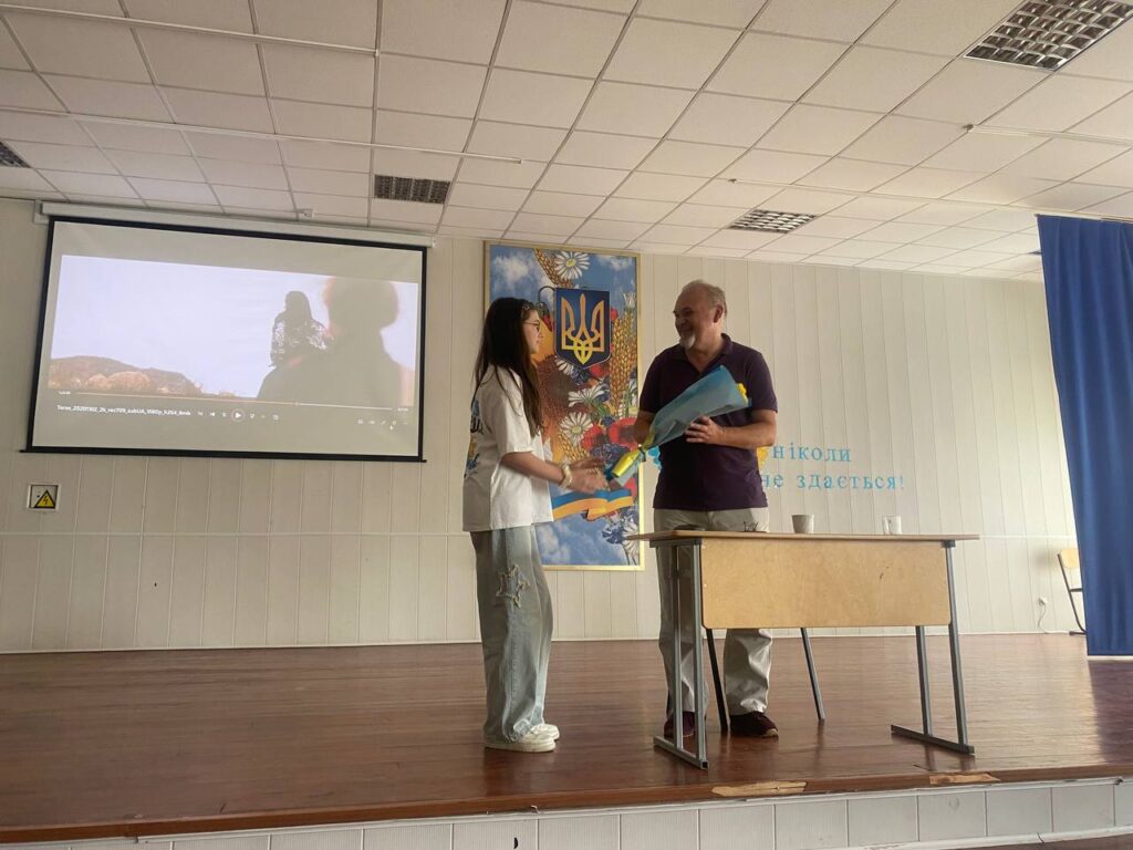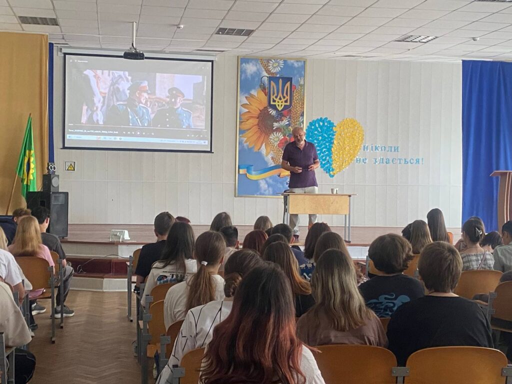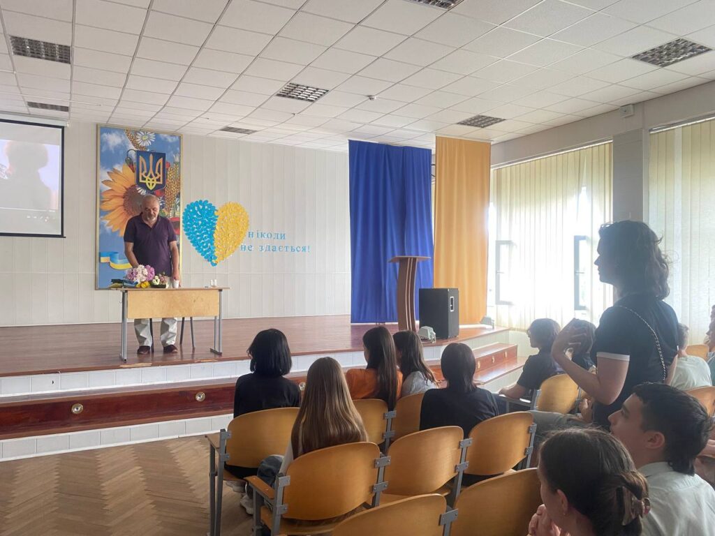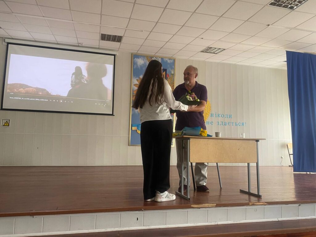Ми мали за честь зустрітись з Денисенком Олександром Володимировичем — українським літератором, актором, режисером, автором теле- і радіопередач. Під час зустрічі школярі не лише глибше пізнали нашу видатну особистість, а й змогли дізнатись багато цікавих фактів про фільм ” Тарас.Повернення “, який не так давно був знятий паном Олександром.