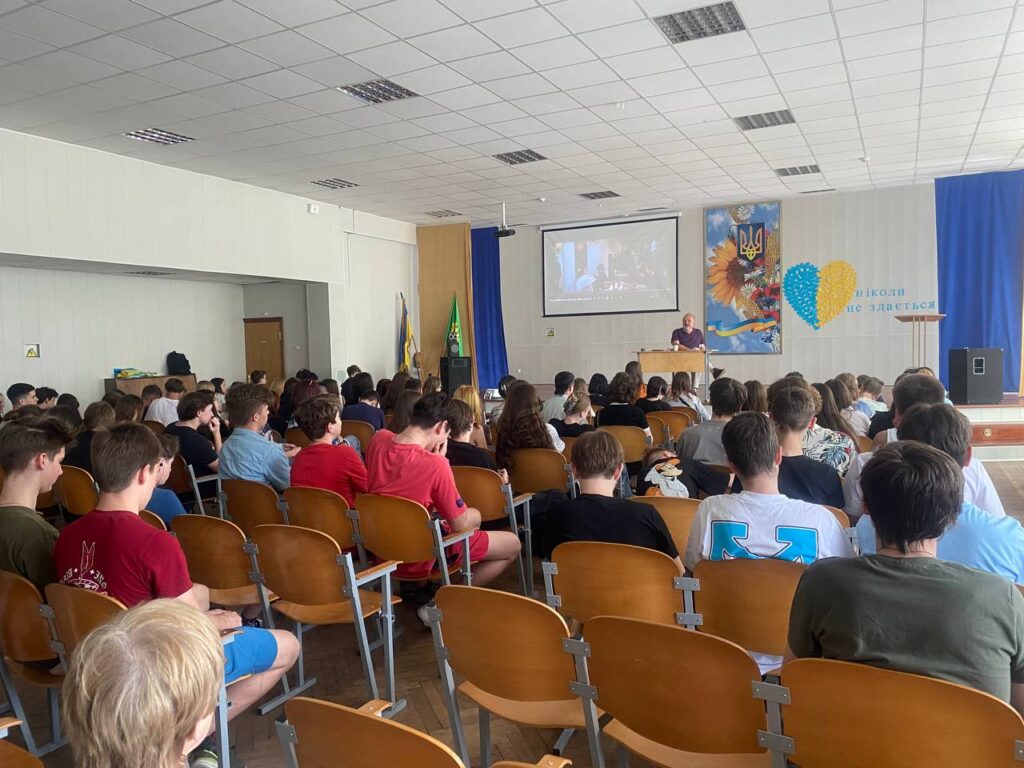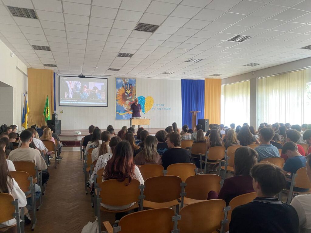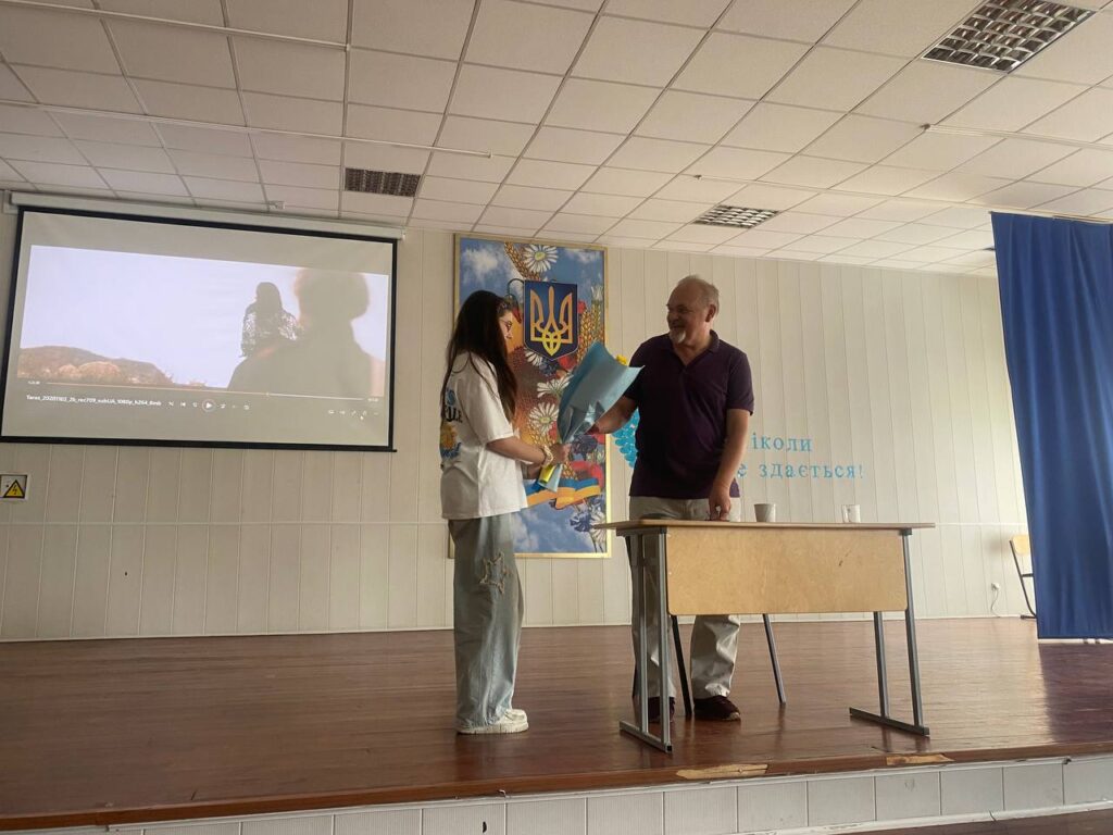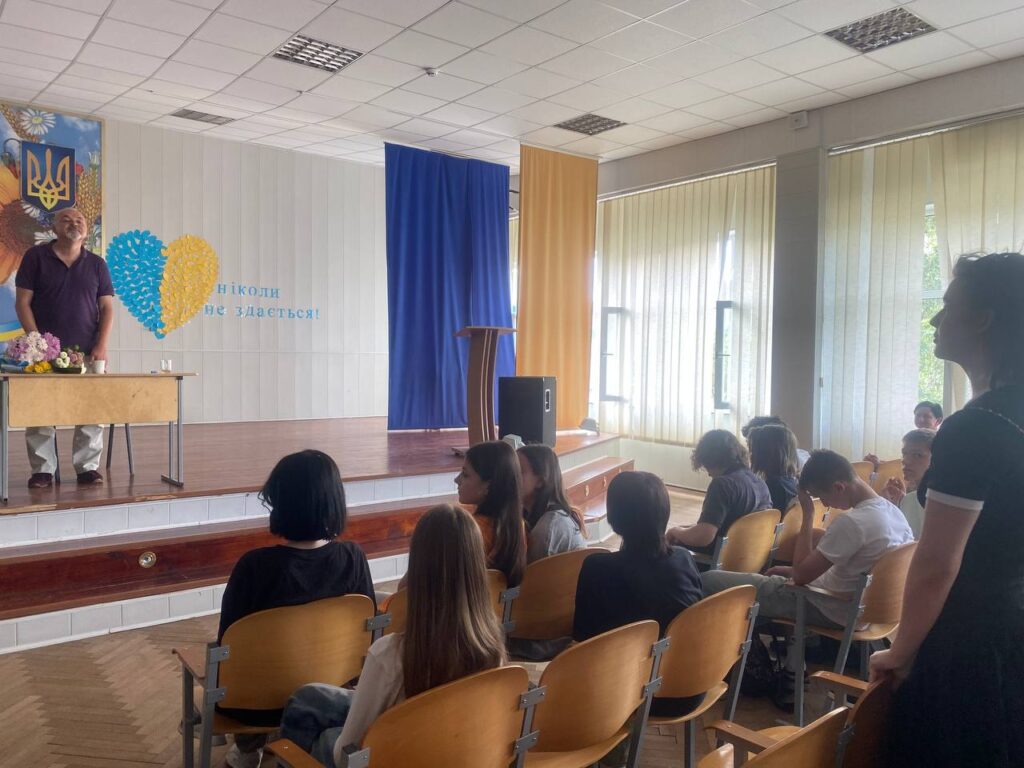 Ми мали за честь зустрітись з Денисенком Олександром Володимировичем — українським літератором, актором, режисером, автором теле- і радіопередач. Під час зустрічі школярі не лише глибше пізнали нашу видатну особистість, а й змогли дізнатись багато цікавих фактів про фільм ” Тарас.Повернення “, який не так давно був знятий паном Олександром.