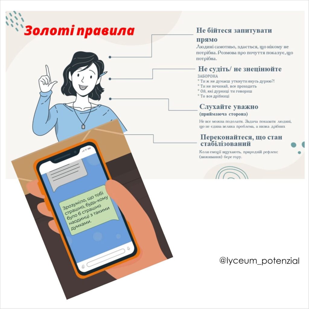 Учні 9-Б класу не слухали лекції, а самі знаходили правильні відповіді. В процесі плідної роботи вони усвідомили, що найлегше – це зрозуміти, що людина має проблему, а от найважче – це поговорити про це. Як почати бесіду? Що робити якщо співрозмовник не йде на контакт? Як наважитися запитати прямо, чи не планує людина зашкодити собі? Як підібрати слова, щоб не зробити гірше?